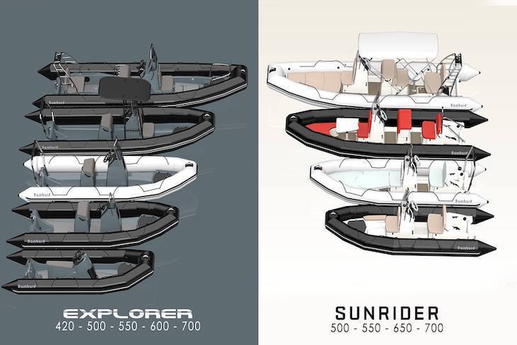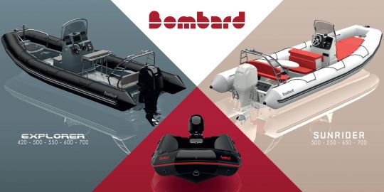 BOMBARD propose à ce jour 2 gammes de semi-rigides (Explorer et Sunrider) et 2 gammes de bateaux souples (Commando et Typhoon) avec un nouveau design et davantage de couleurs et de matières.