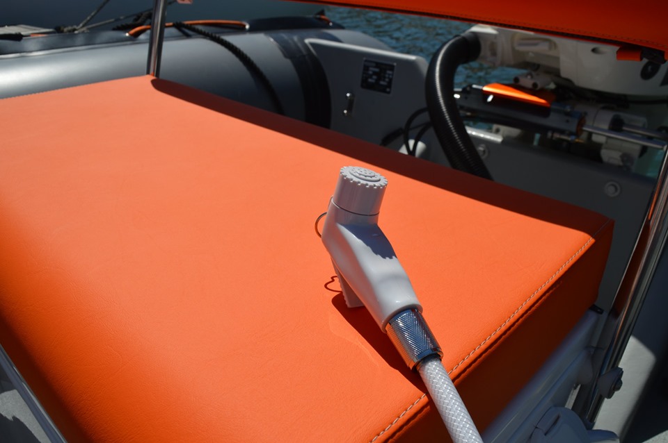 La sellerie de couleur orange, particulièrement élégante aux côtés du gris Zeppelin des flotteurs et du blanc de la console, confère à l’ensemble un esprit dynamique et haut de gamme propre à la marque.