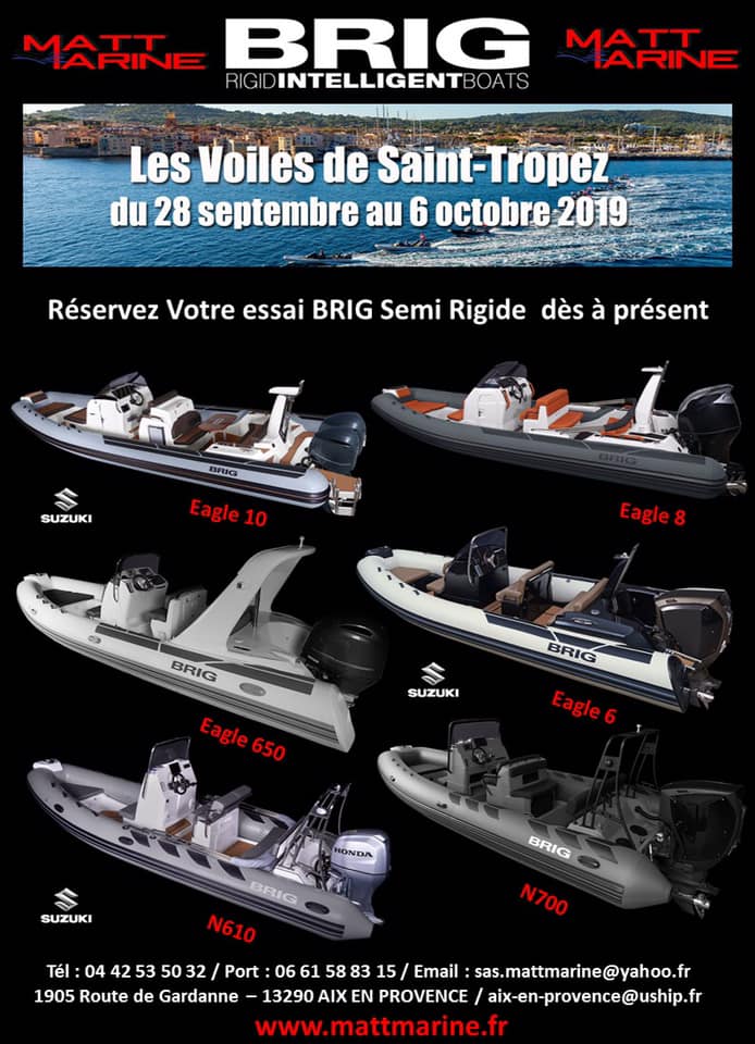 Chaque fin d’été, le souffle de la passion ranime le célèbre port varois dans la perspective d’une semaine d’exception. Découvrez des yachts de tradition avec des bateaux du troisième millénaire. Plus de 300 bateaux mesurant jusqu’à 50 mètres régatent chaque jour dans le golfe de Saint-Tropez à partir du dernier week-end de septembre 2019. Les semi-rigide BRIG seront les bateaux d’assistance officiels et géreront la sécurité de la manifestation.