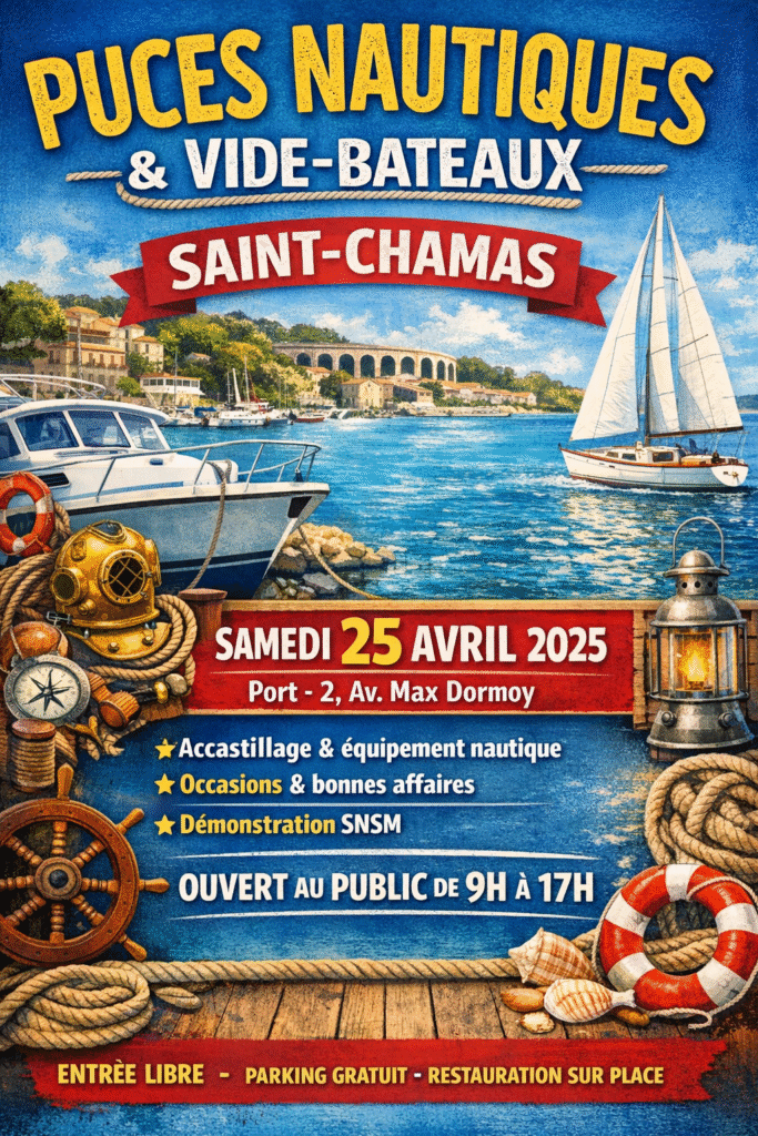 Saint‑Chamas (Bouches‑du‑Rhône), 25 avril. — Les Puces nautiques et vide‑bateaux reviennent samedi au port de Saint‑Chamas. L’Association des plaisanciers organise cette cinquième édition, ouverte au public dès 9 h.